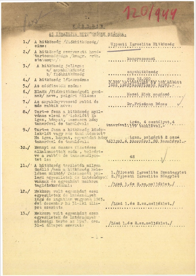 The handful of survivors from Újpest reestablished their communities in 1945: both the Orthodox and Neolog communities were revived. Újpest became part of Budapest in 1950, and the Neolog and Orthodox communities of the capital were merged under the name Budapest Israelite Community at the behest of the communist authorities.