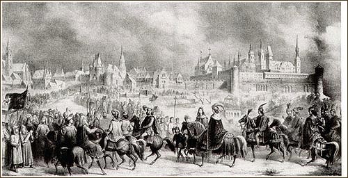When Matthias and his newly wed wife, Beatrix of Aragon, arrived in Buda in December 1476, the delegation of high nobility and urban commoners welcoming the royal couple also included representatives of the Jewish community. The forty-six-man cavalry was led by Jakab Mendel, the prefect himself, carrying a naked sword. The Jewish dignitaries marching in their highly ornate clothing and carrying a flag with a Star of David and Hebrew inscriptions on it, and the baskets full of silver held by the horsemen, demonstrated the wealth and strength of the Jewish community of Buda to foreign visitors. Causing some turmoil, the Jewish alderman tried to get the queen to kiss the decorated shield of the Torah scroll, which she refused in panic. Nevertheless, the costs of the royal wedding were partly covered by the Jewish community.