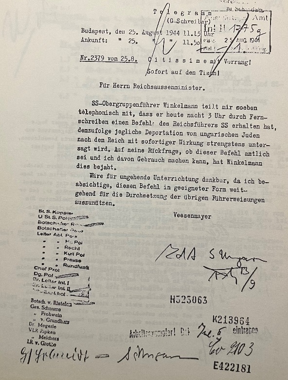 Seeing the successful advance of the Red Army in Bucharest, the Romanian pro-royal military group overthrew Marshal Antonescu on Wednesday, August 23, and Romania switched to the Allies. The next day, Horthy summoned the German ambassador Veesenmayer and told him that the Jews would not be extradited to Germany. He promised to remove them and lock them in camps outside Budapest. According to Veesenmayer’s report, the Regent also added, "he is willing to exterminate the Jews if they make the slightest trouble." Eichmann was informed by the Ministry of the Interior that the deportations had been stopped, and, seeing the situation, he asked his supervisors to summon him back from Budapest. Berlin responded to the news at 3 a.m. on August 25th. The head of the SS, Heinrich Himmler, "strictly forbade ... any deportation of Hungarian Jews to the Reich ... with immediate effect”.